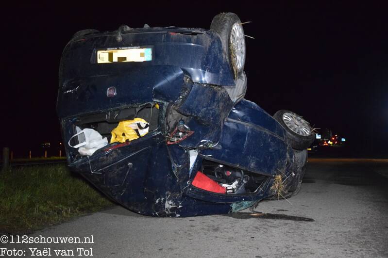 Rond 01.00 uur werd een zwaar beschadigde auto aangetroffen welke op zijn kop in een sloot terecht was gekomen onder aan een dijk langs de N59. Omdat het niet duidelijk was of er personen onder of in het voertuig zaten is de auto met een kraan van de brandweer uit de sloot getrokken. Al snel bleek van een slachtoffer geen sprake. Inmiddels was ook bij de politie bekend geworden dat de bestuurder van het voertuig zichzelf gemeld had bij de huisartsenpost met verwondingen.