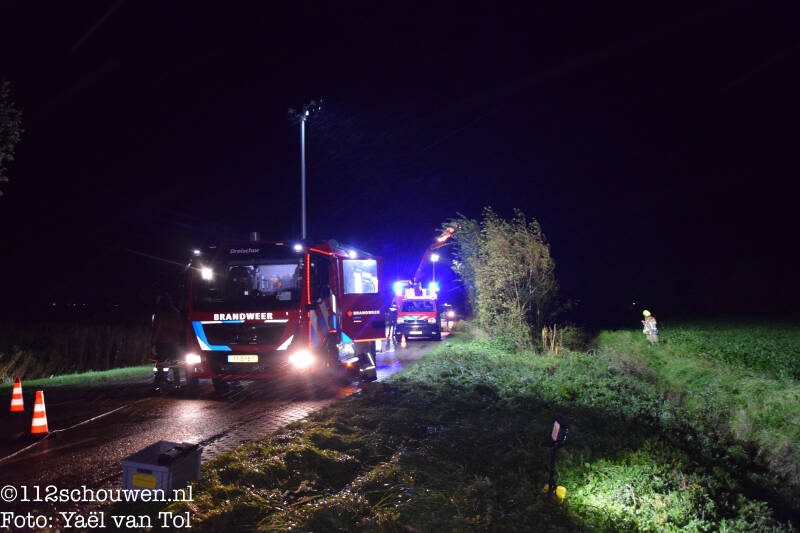 Een personenauto met twee inzittenden was van de weg geraakt en in droge sloot terechtgekomen. De auto lag zo'n 25 meter verder van waar het van de weg was geraakt achter een aantal bosjes waardoor het even duurde voor de auto gevonden werd. De bijrijder was uit de auto gegaan voor hulp, bij aankomst van de brandweer kon hij de auto niet meer vinden en wist hij de exacte locatie van het ongeval niet meer.