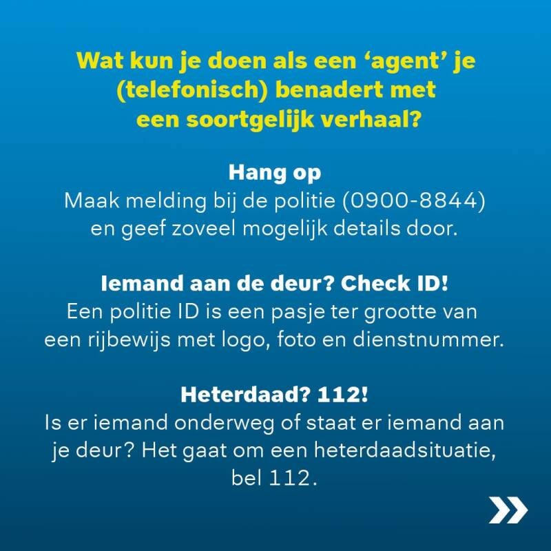 Wordt u benaderd door deze nepagenten, neem dan direct contact op met de politie via 112! De politie zal nooit geld of goederen meenemen om veilig te stellen. "Doelwit: ouderen mensen, waarschuw uw ouders" aldus de politie.