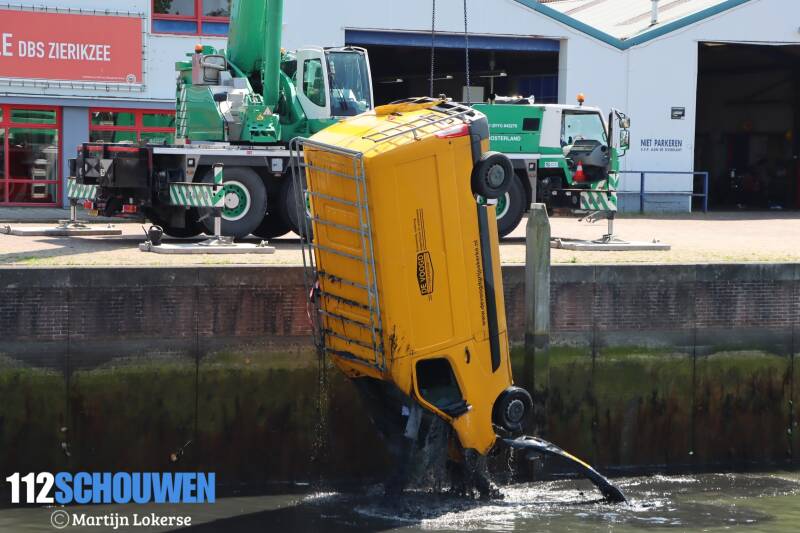 ZIERIKZEE - Een bedrijfsbus is vrijdagmiddag in de haven bij de Vissersdijk in Zierikzee terecht gekomen. Een grote kraan moest er aan te pas komen om de bus weer op het droge te krijgen.