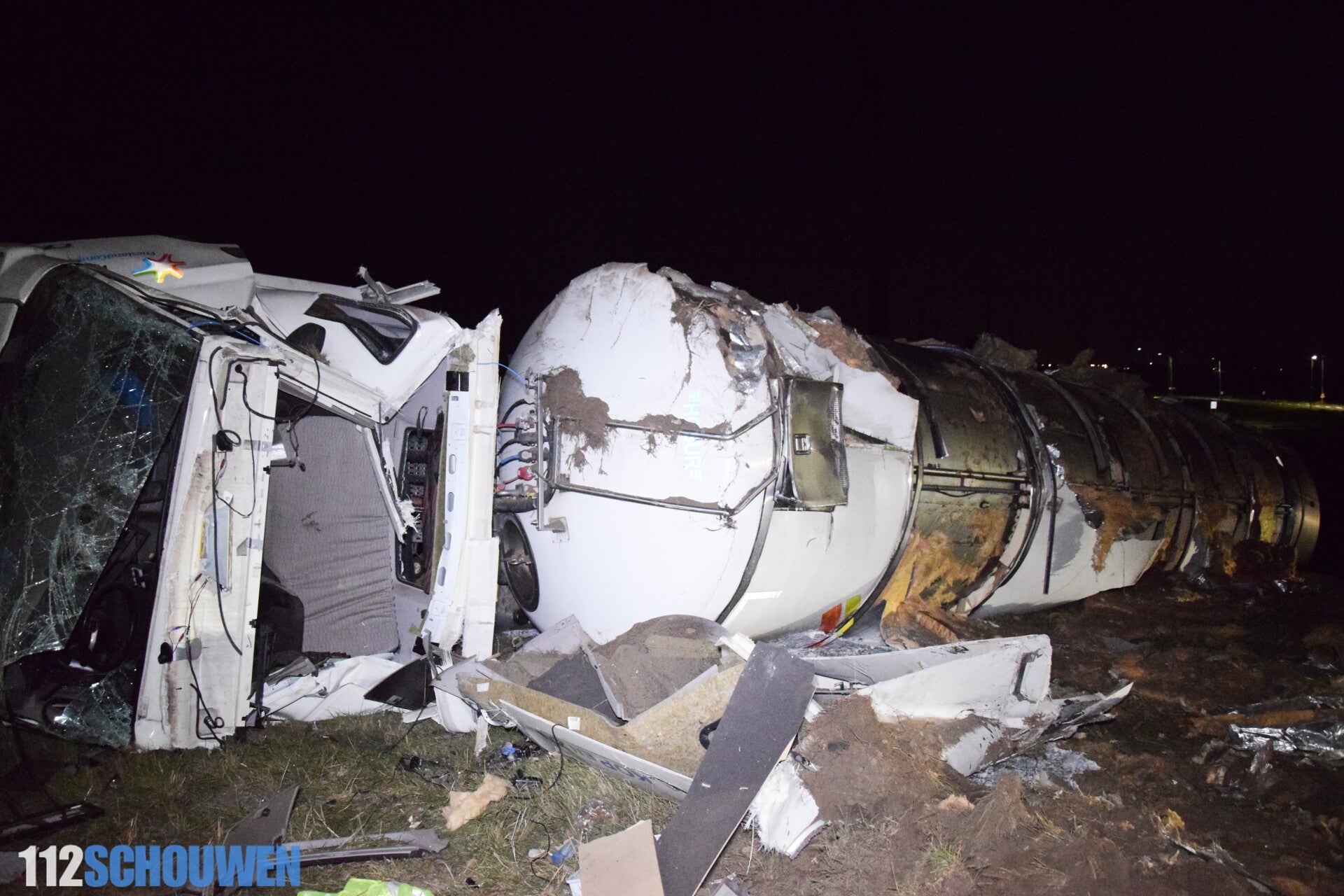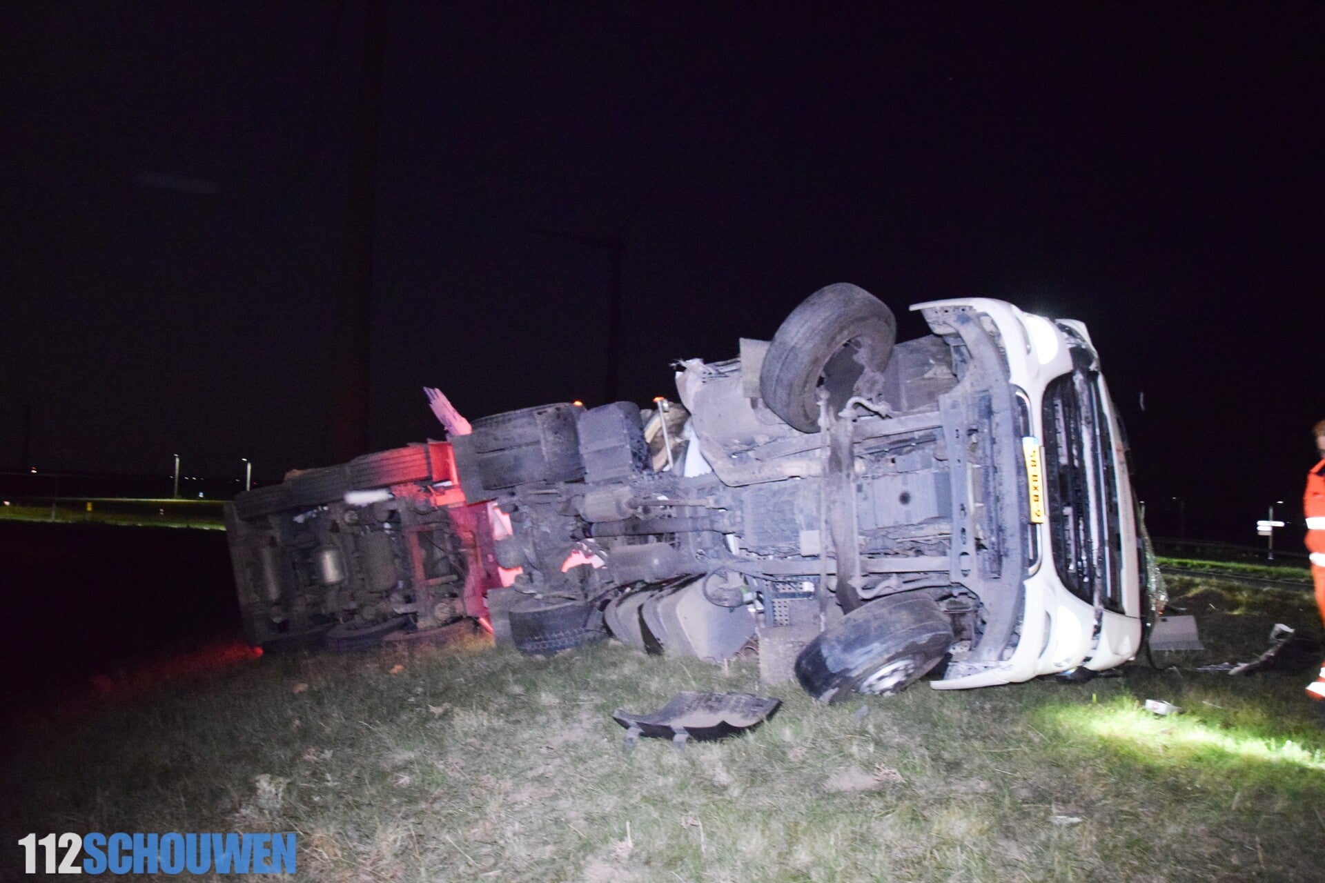De combinatie raakte rond 03.45 uur van de weg, sloeg over de kop en kwam in de berm terecht. Brandweerploegen uit Bruinisse en Den Bommel werden met spoed ingezet voor de bevrijding van het slachtoffer, maar deze bleek al uit het voertuig e zijn. De chauffeur raakte lichtgewond en is naar het ziekenhuis vervoerd.