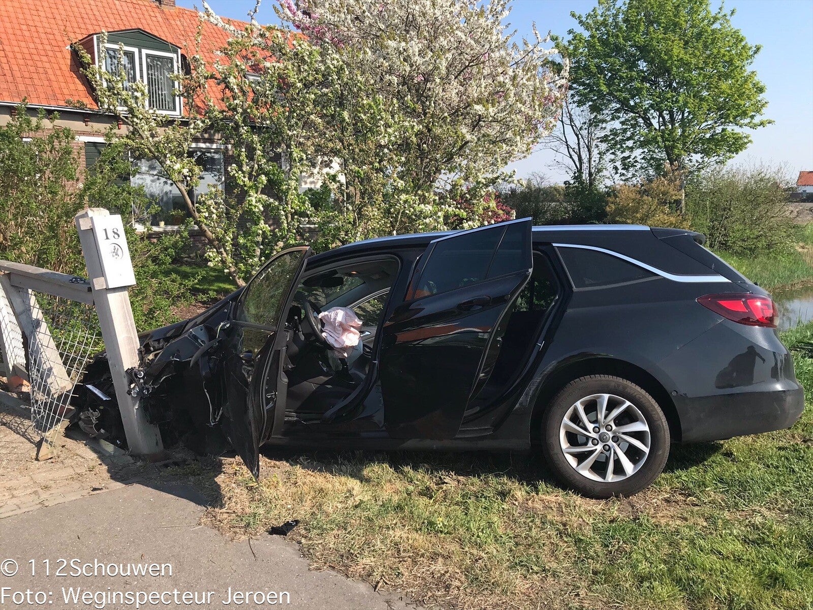 Door nog onbekende oorzaak kwamen twee personenauto’s met elkaar in botsing op de rijksweg. Door de klap braken van beide auto’s een band af en kwam één auto in een voortuin tot stilstand. Ook een informatiebord van Connexxion brak af. Twee betrokken personen zijn nagekeken door ambulancepersoneel maar volgens de weginspecteur van Rijkswaterstaat raakte ze niet ernstig gewond. Beide voertuigen zijn weggesleept.