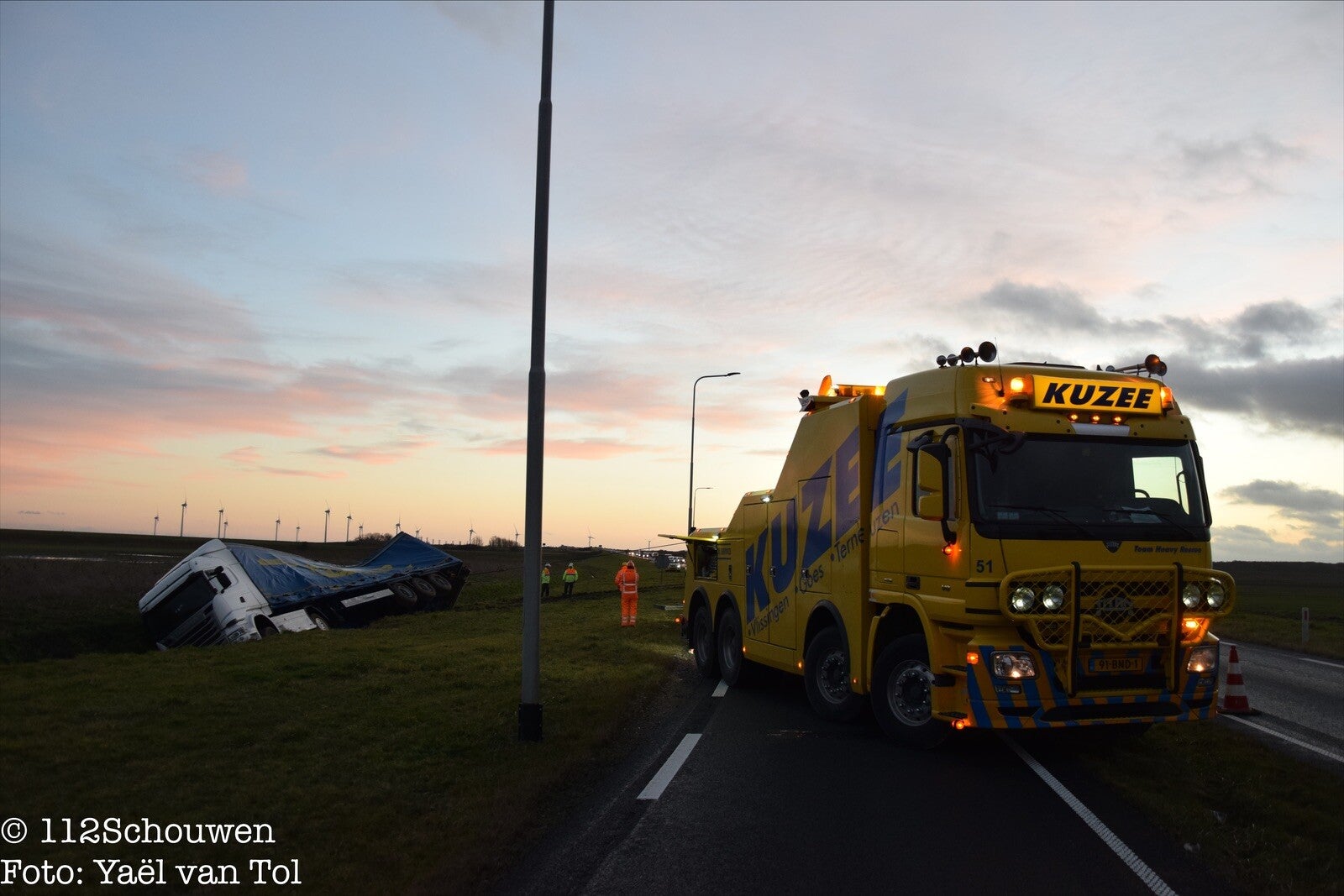 BURGH-HAAMSTEDE - Een vrachtwagen is maandagmiddag in een sloot belandt langs de N57 ter hoogte van Burgh-Haamstede.
